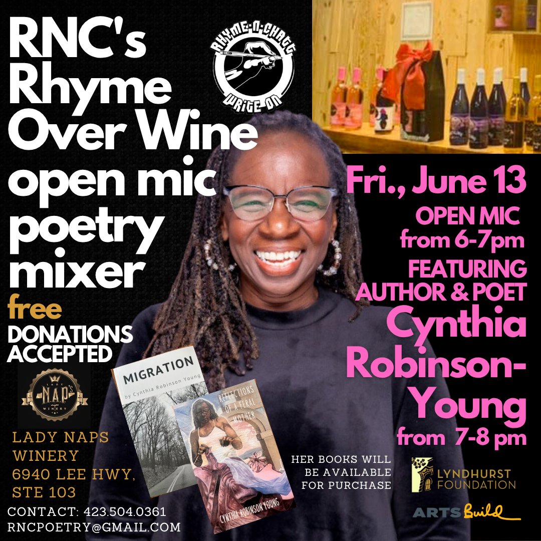 A free open mic poetry mixer featuring author and poet Cynthia Robinson-Young, presenting her book Migration. Books will be available for purchase. The evening begins with an open mic session, followed by Cynthia Robinson-Young’s featured reading. Donations are accepted.